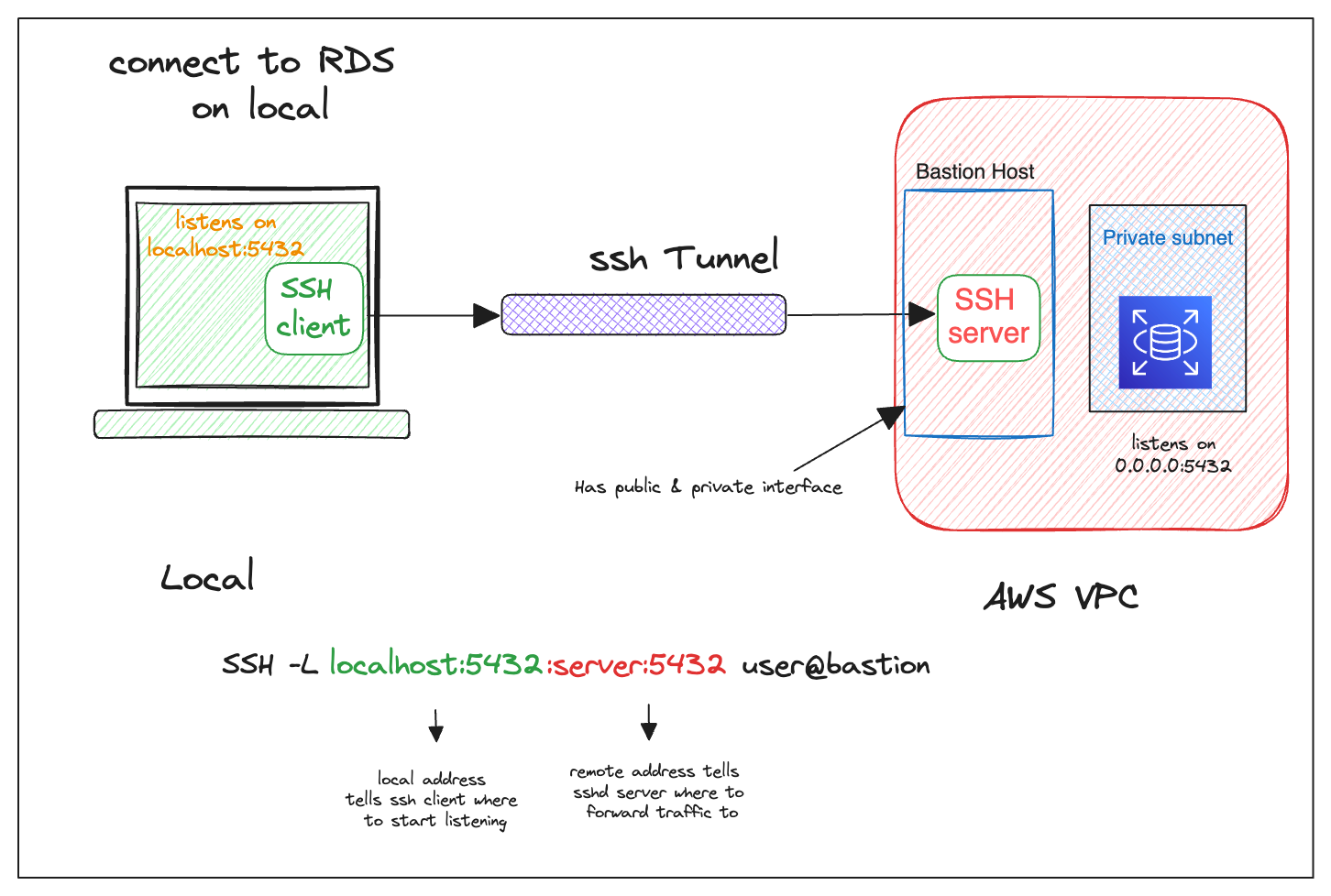 The -L flag indicates we’re starting a local port forwarding. What it actually means is: